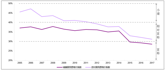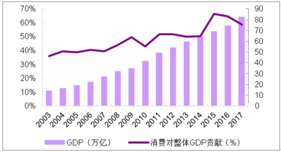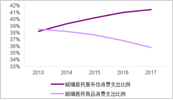 15-16 年地產繁榮期后,國內迎來又一次消費升級,居民消費意愿顯著加強,具體體現在三點:(1)消費對整體 GDP 的貢獻由 2014 年的 50.2%,提升至 2017 年的 58.8%。(2)城鎮居民服務性消費支出占比由 2014 年的 39.3%上升至 2017 年 41.4%,商品消費支出占比則下降至 35.8%,服務性支出上升成為趨勢。(3)衡量消費升級的關鍵性指標:恩格爾系數,由 2014 年度的 37%下降至 2017 年 29.3%,城鎮居民逐步步入富裕階段。