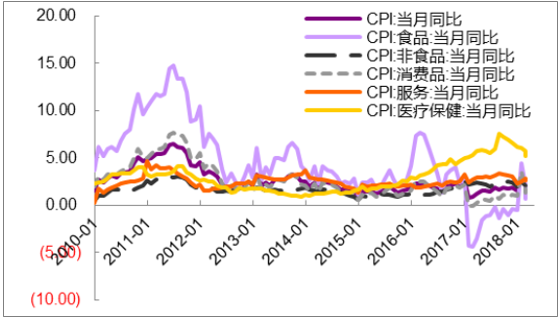 16 年以來醫療保健 CPI 領跑全行業(%, 截至2018.04)